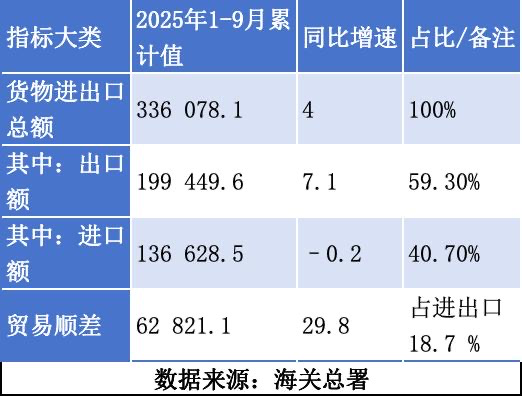 据海关总署统计,2025年1—9月,全国进出口总额为336078.1亿元人民币,同比增长4.0%。其中,出口额为199449.59亿元,同比增长7.1%;进口额为136628.52亿元,同比下滑0.2%;贸易顺差62821.07亿元,同比扩大约30%。
