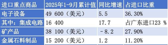 2025年1—9月,中国进口商品中,电子设备、矿产品和金属石料制品分列前三,分别进口6965亿美元、5340亿美元和2133亿美元,合计占进口总值的75.8%。