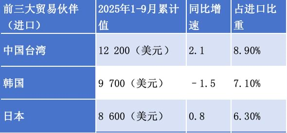 其中德国、荷兰、法国为前三大欧盟内市场。进口方面,中国台湾、韩国、日本为前三大来源地,分别进口1693亿美元、1348亿美元、1194亿美元,合计占进口总值的37.8%,反映国内电子制造对东亚供应链的高度依赖。